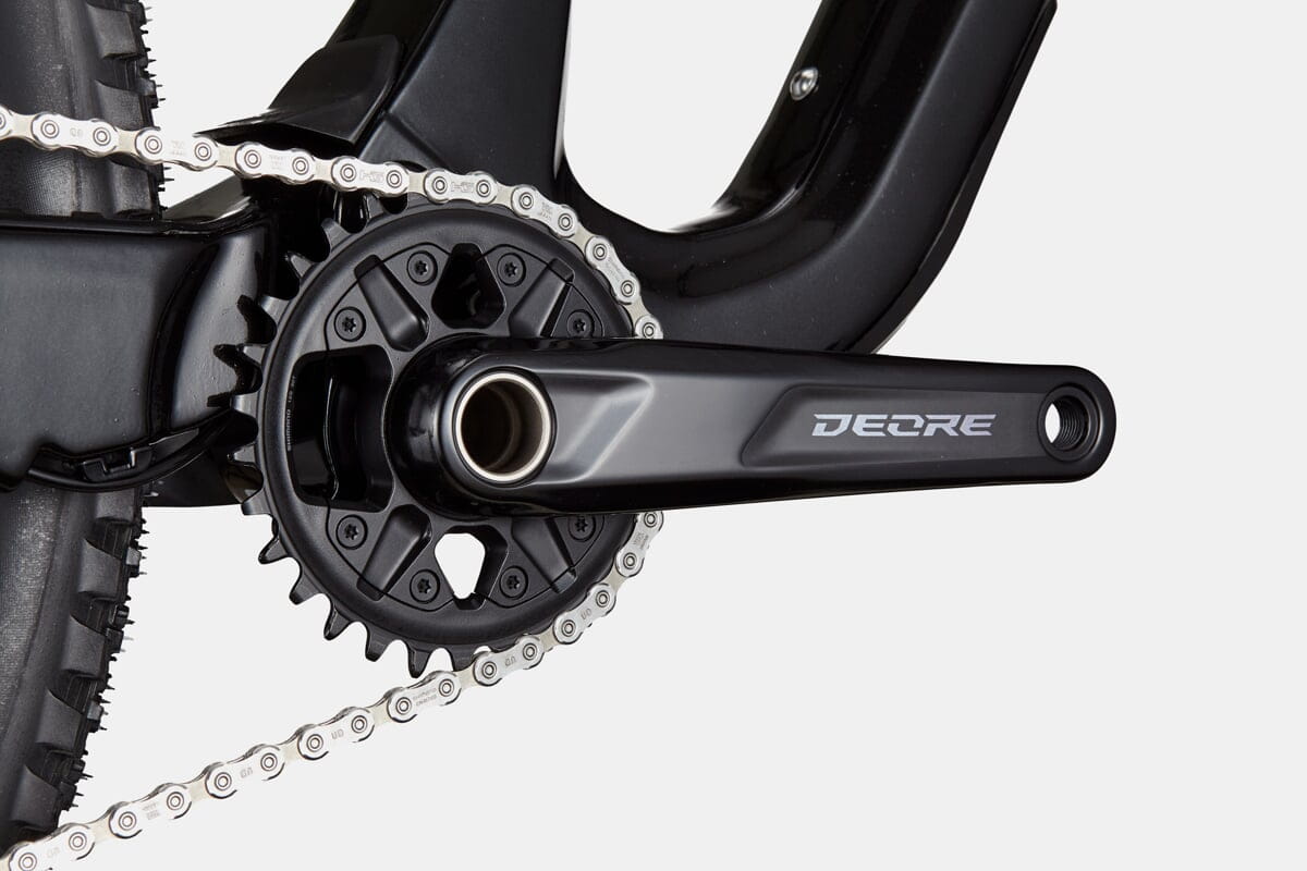 Za kontrolę nad trasą odpowiada widelec RockShox Pike Select o skoku 140 mm oraz tylny amortyzator RockShox Deluxe Select+, które pomagają lepiej wybierać nierówności i utrzymywać przyczepność. Napęd Shimano XT/SLX 1x12 zapewnia szeroki zakres przełożeń i precyzyjną zmianę biegów, a czterotłoczkowe hamulce hydrauliczne Shimano Deore zwiększają siłę hamowania i pewność jazdy w stromym terenie. Całość uzupełniają koła tubeless ready, regulowana sztyca Cannondale DownLow Dropper i praktyczny StrapRack, dzięki czemu rower jest gotowy na intensywną jazdę trailową bez kompromisów.