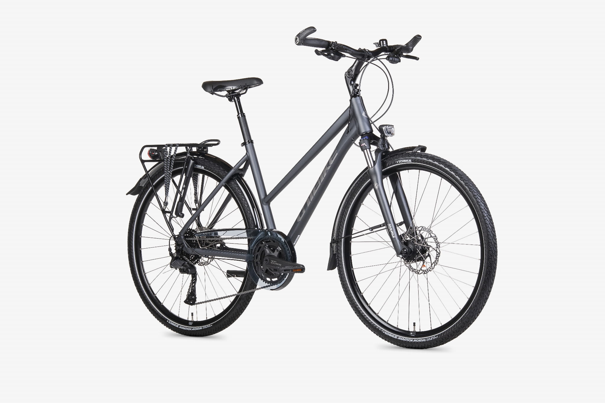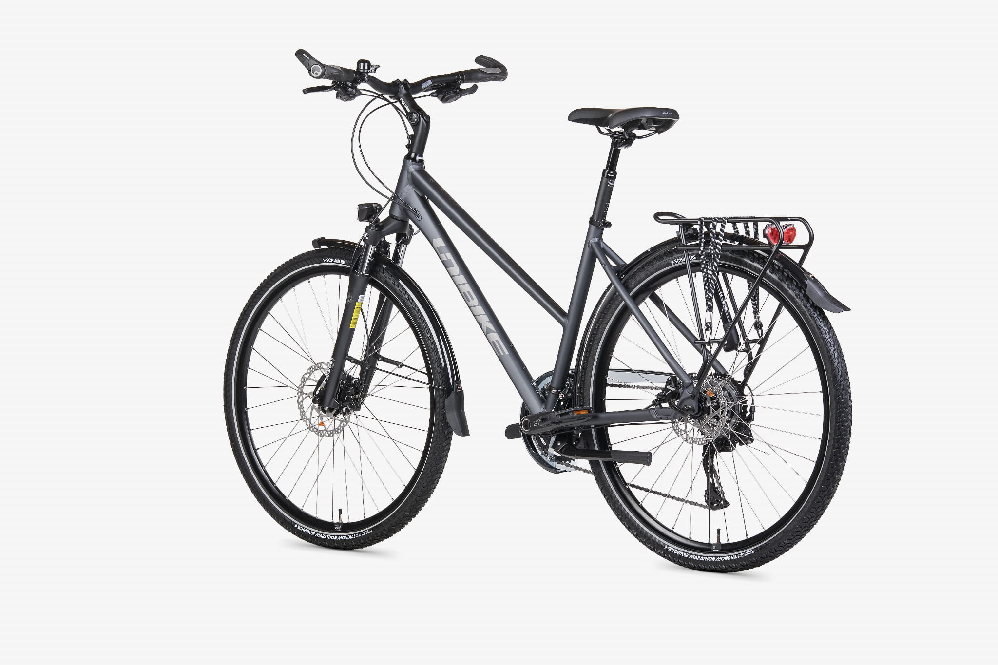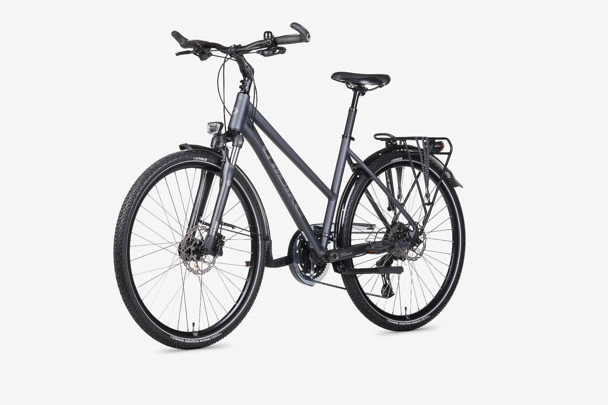 - Turystyczne wyposażenie: bagażnik pod sakwy, błotniki, podpórka centralna, pompka i dzwonek