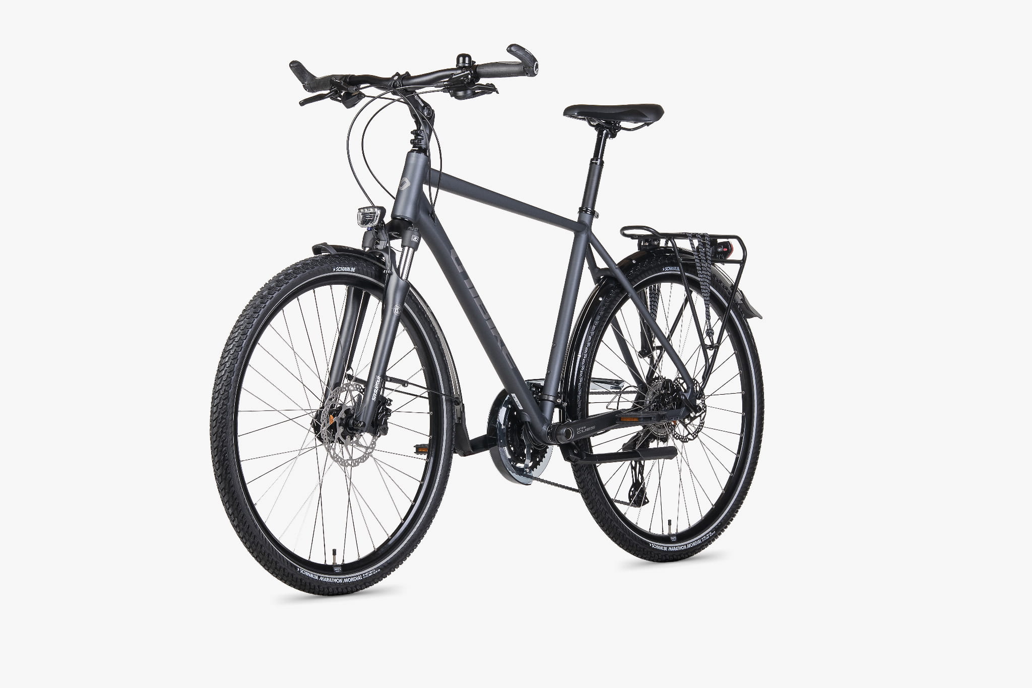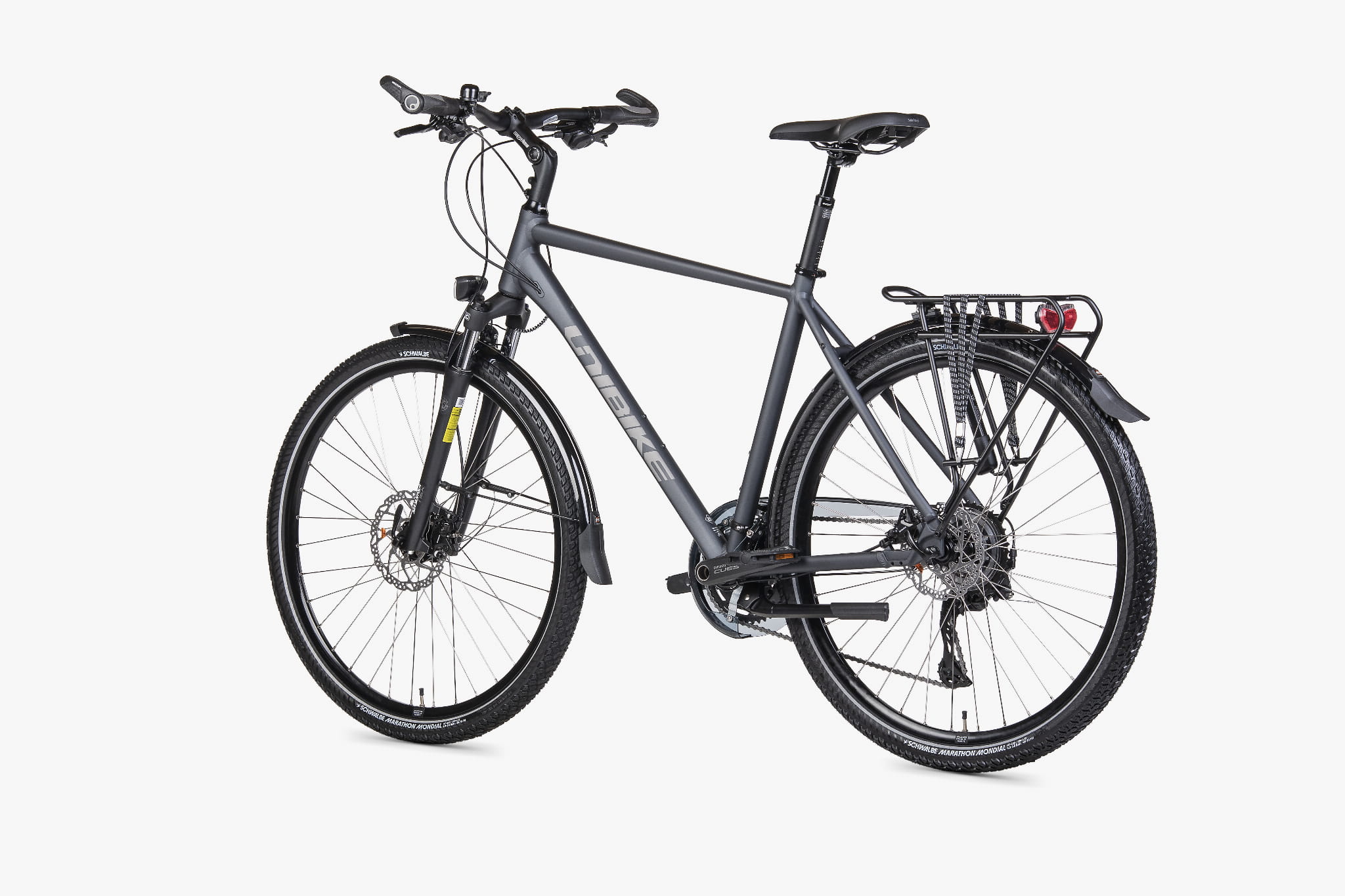 - Wyposażenie trekkingowe: bagażnik pod sakwy, błotniki, podpórka, pompka, dzwonek
