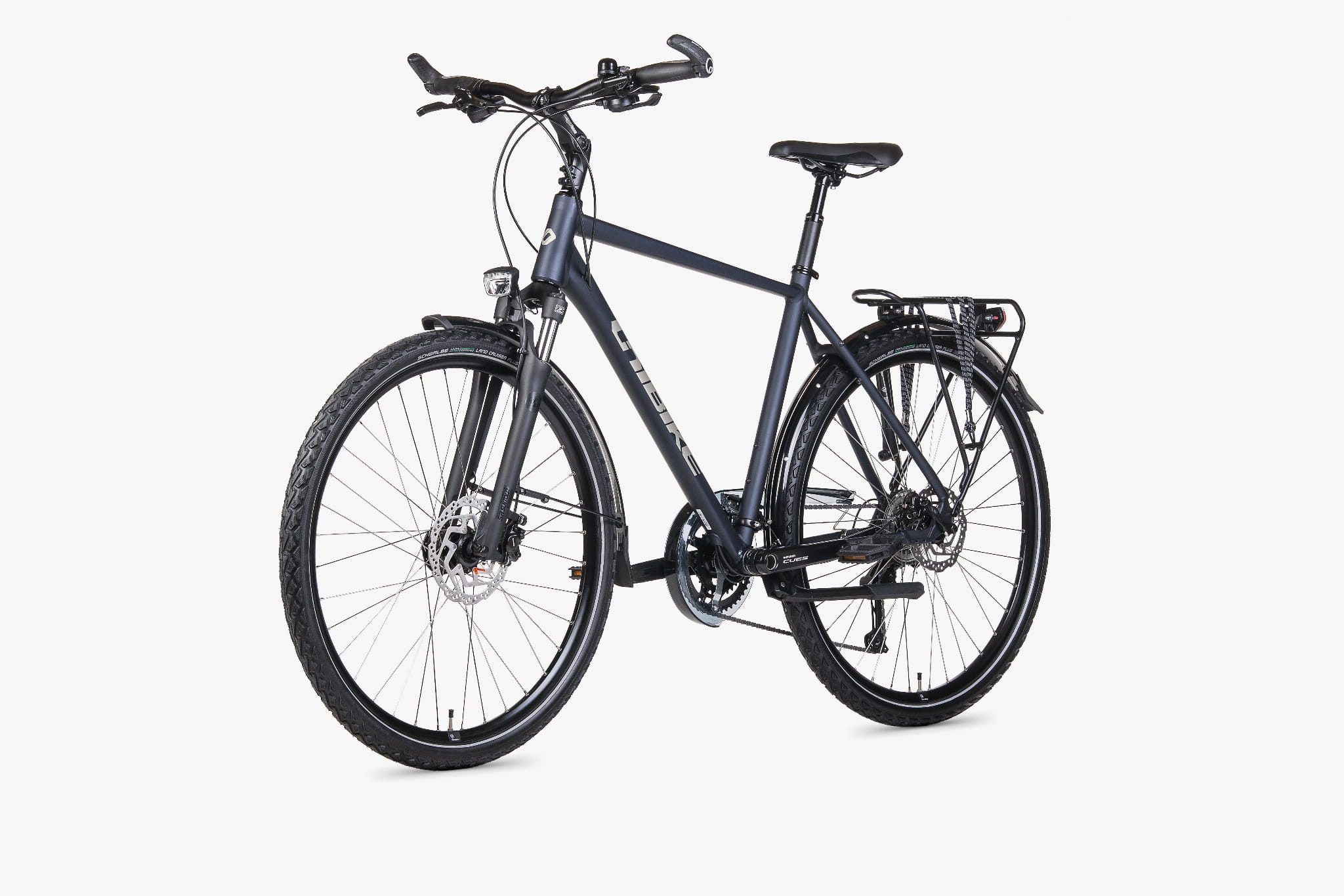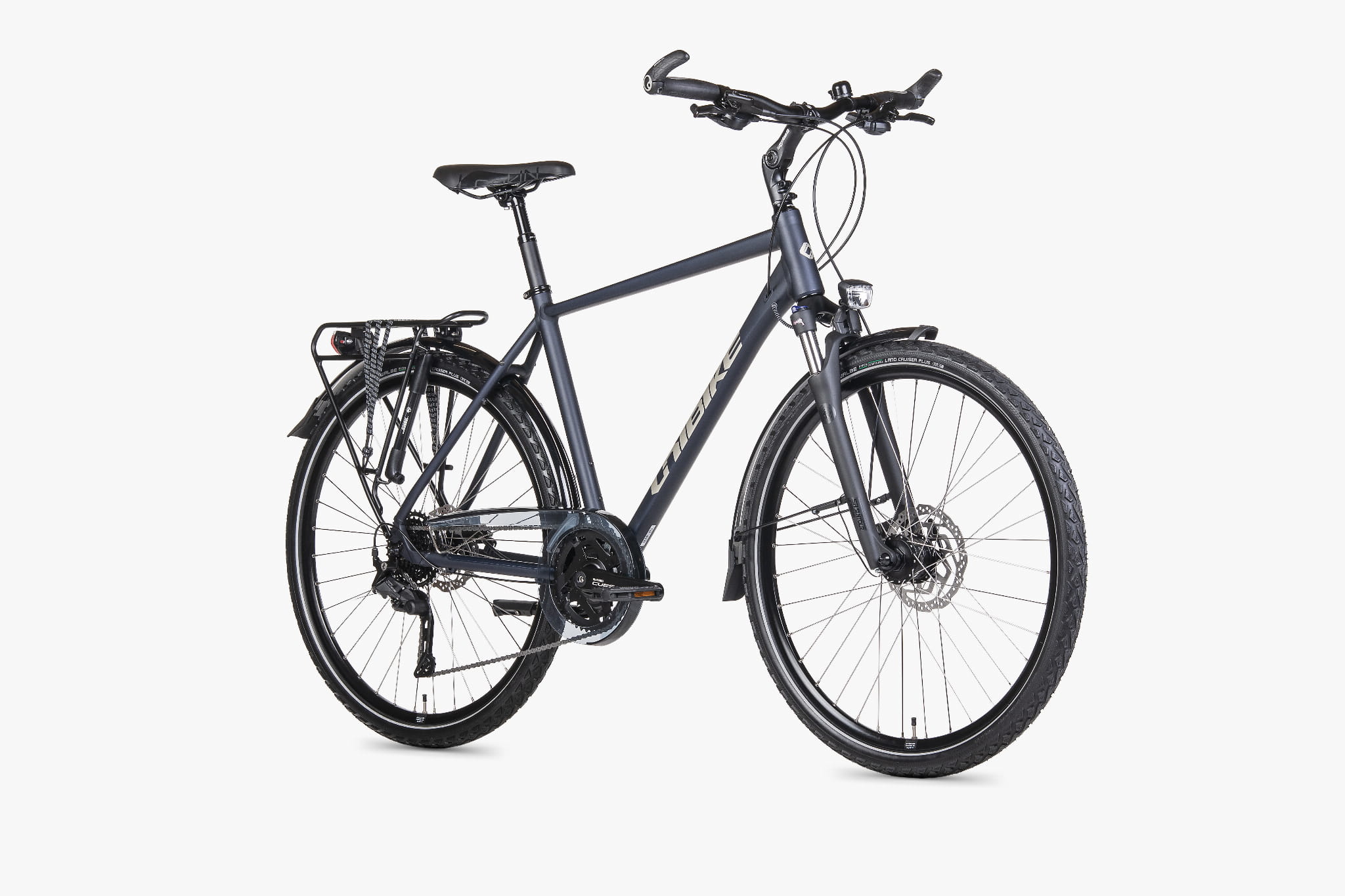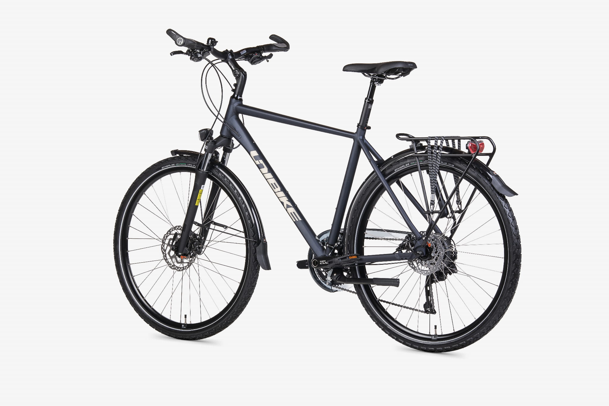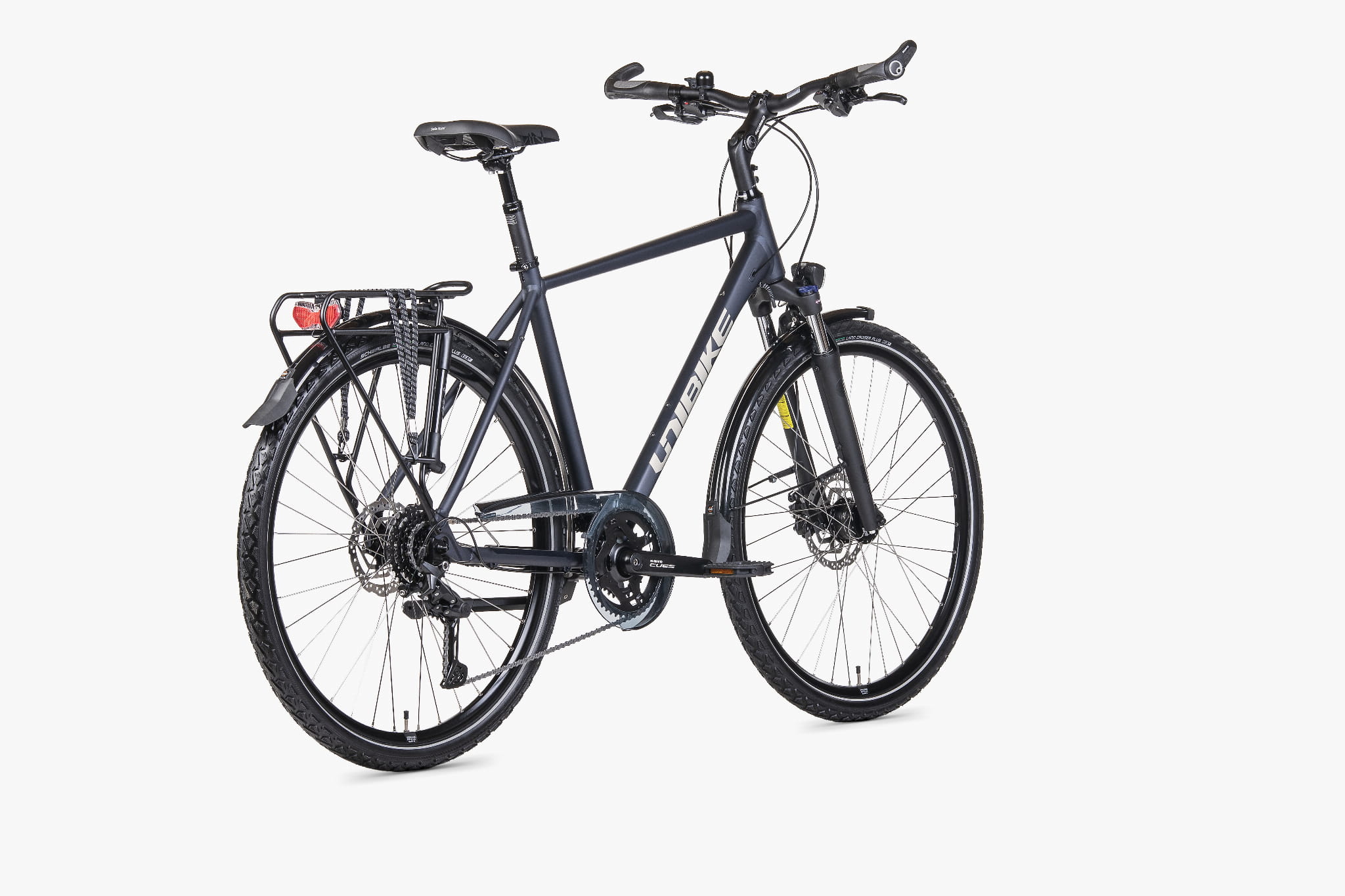 Wewnętrzny zestaw sterowy AHEAD FSA No.10 (1-1/8") wspiera precyzję prowadzenia. Koła z obręczami JHT (DISC, zakuwki) i nierdzewnymi szprychami SAPIM Leader są przygotowane do pracy pod bagażem. Z przodu pracuje piasta-prądnica Shimano Nexus 3D37 (36H, czarna), z tyłu Shimano QC400 (36H), a do zestawu dobrano dętkę Schwalbe z zaworem Clik.