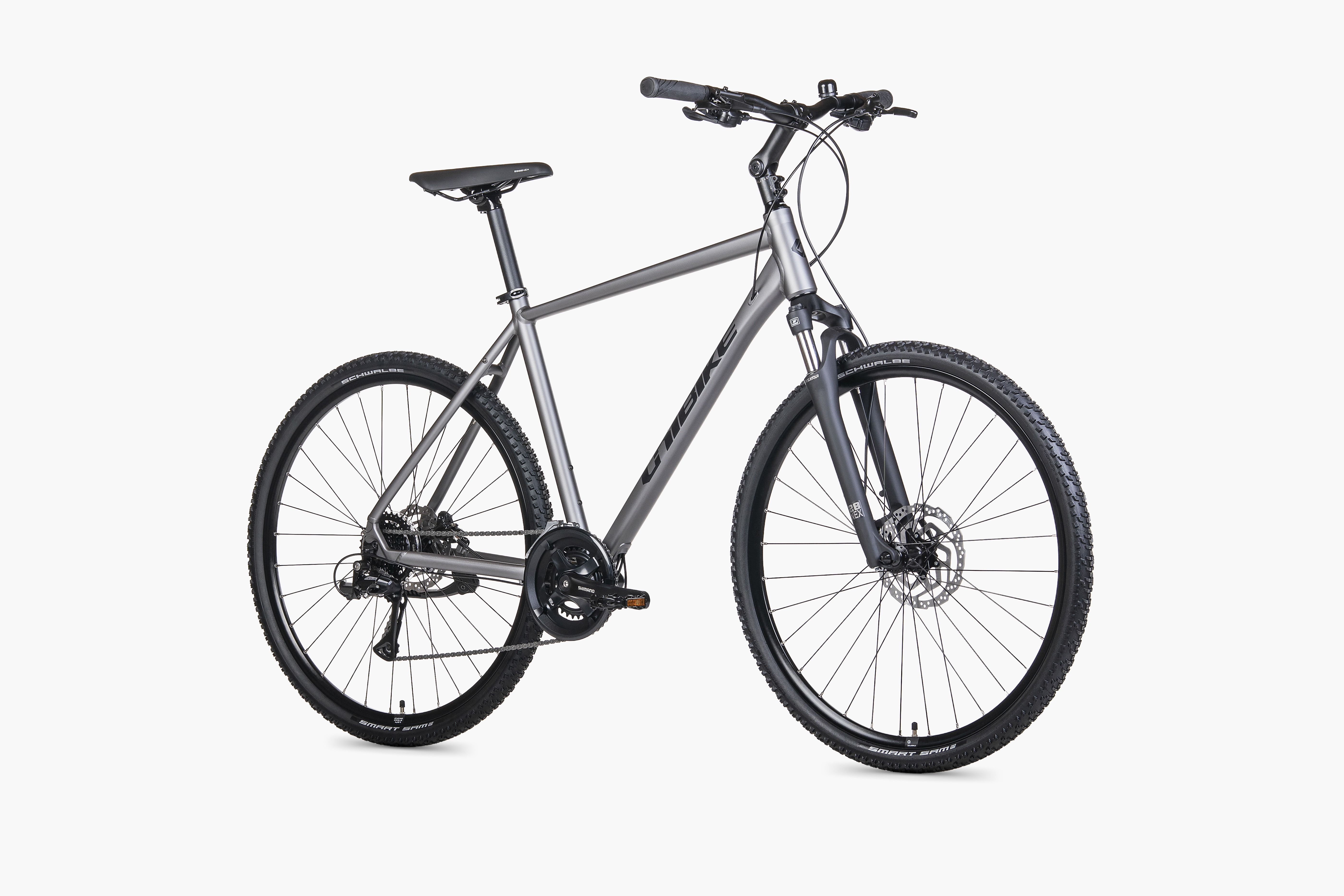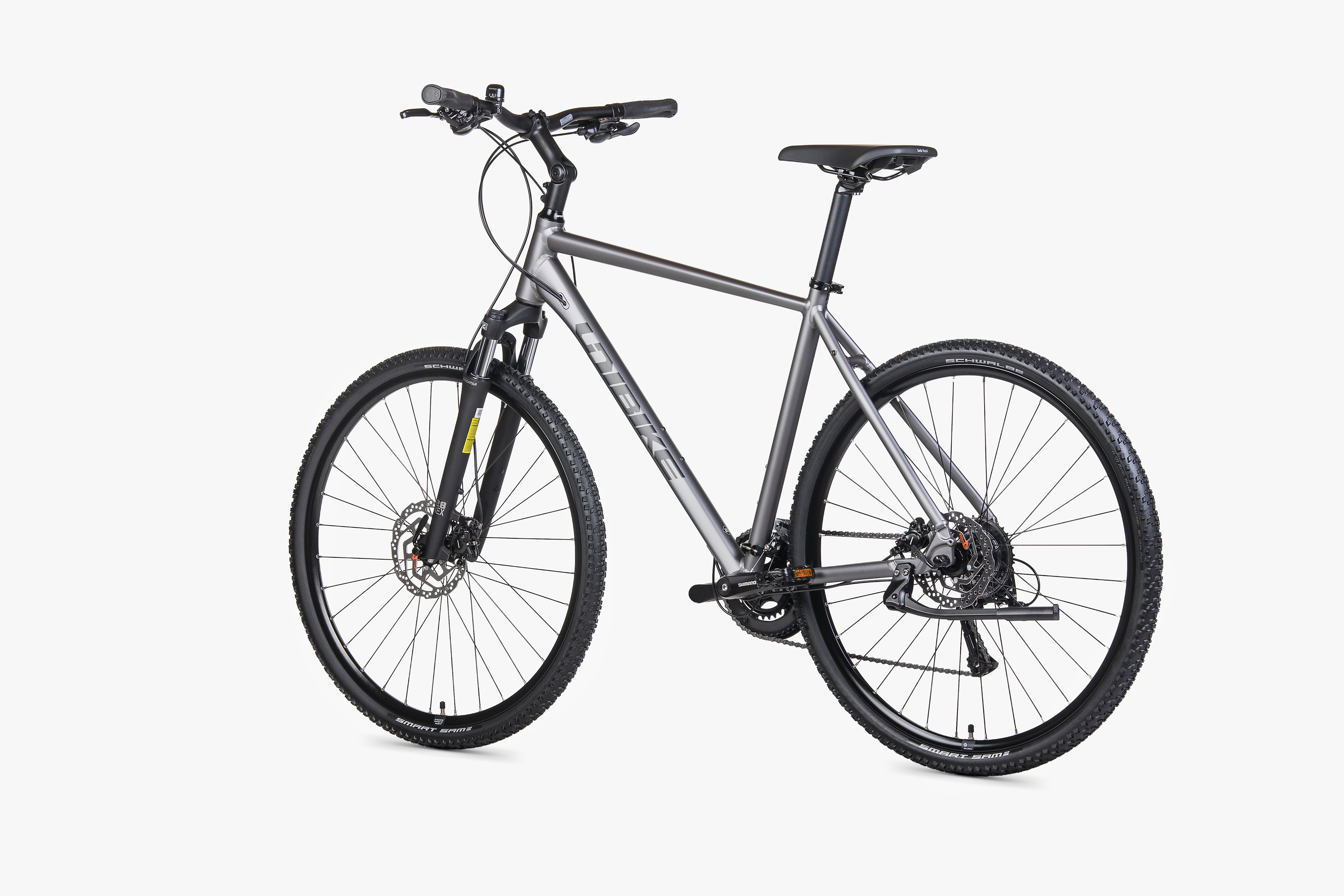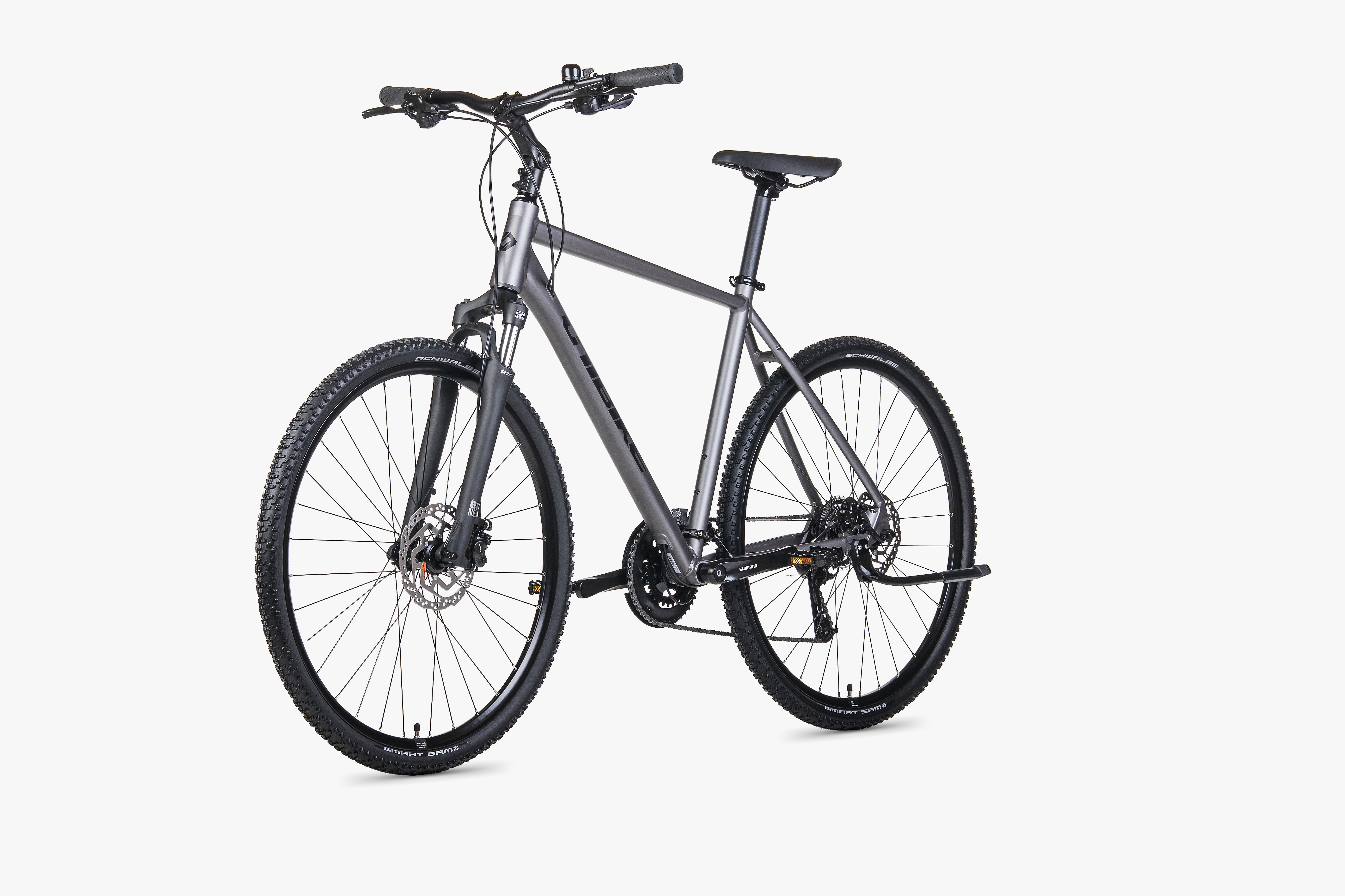 Za bezpieczeństwo odpowiadają hydrauliczne hamulce tarczowe Shimano MT200 – działają pewnie i przewidywalnie, szczególnie gdy jest mokro lub gdy nawierzchnia się zmienia. Manetki Shimano M315 ułatwiają obsługę biegów w ruchu miejskim i na trasie.