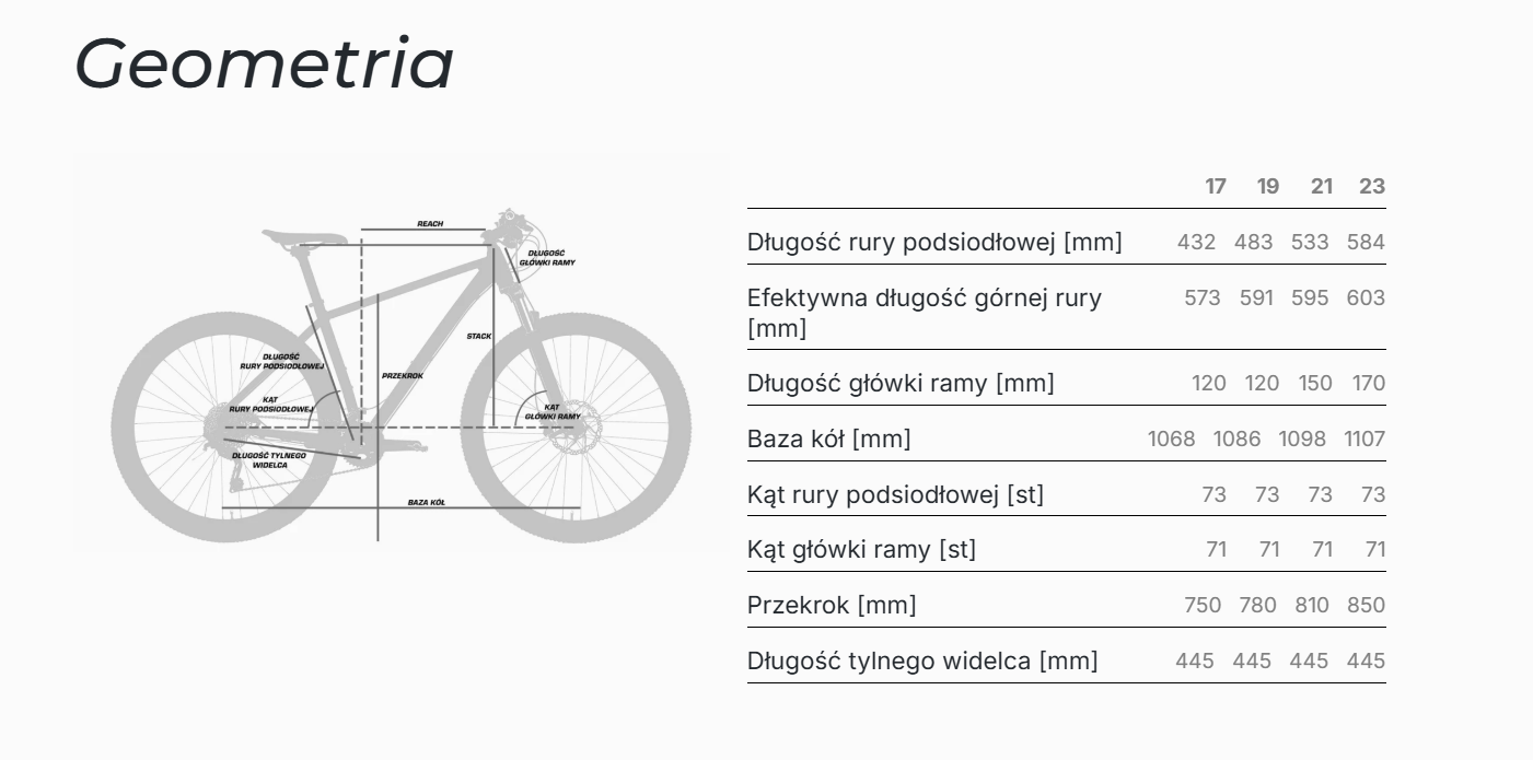 - Rama ALU 6061-T6 (hydroforming), stożkowa główka 1-1/8”–1.5”; rozmiary: 17”, 19”, 21”, 23”